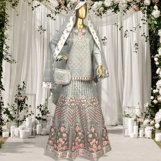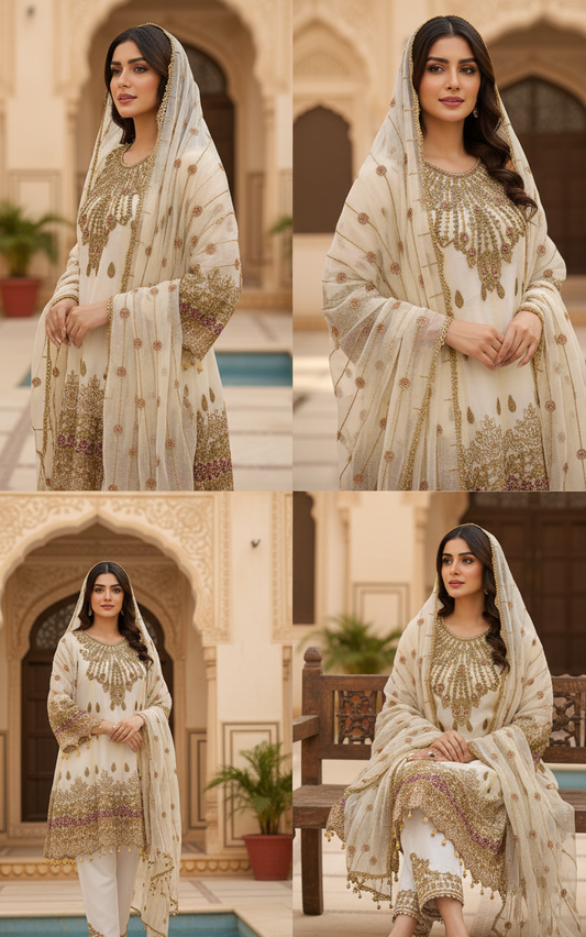 Elegant embriodred Organza Shirt with Chiffon Dupatta & Soft Malai Trousers MMG-806
