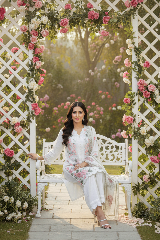 3-Piece Cotton Embriodered Shirt, Silk Dupatta. & Trouser with Stylish Lace MMG-14