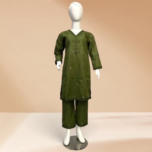 3-Piece Olive Green Cotton Suit with Silk Dupatta MMG-32