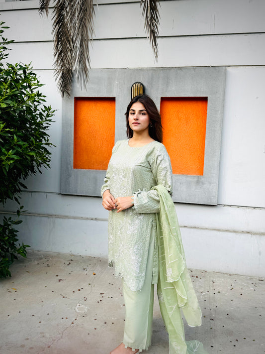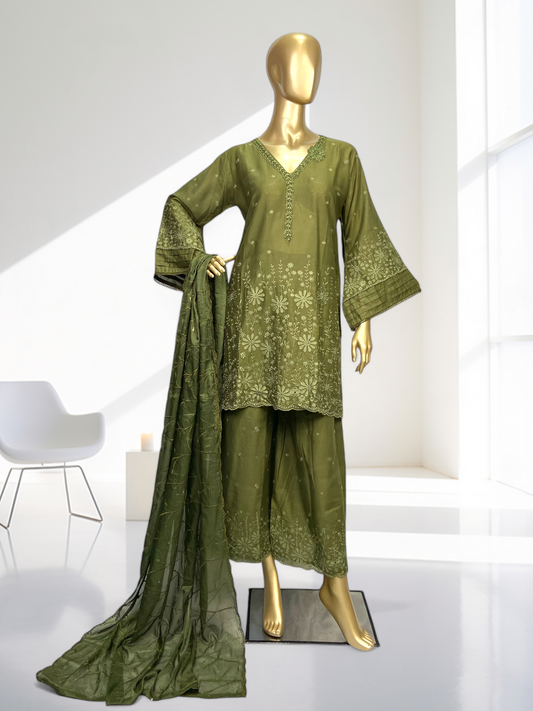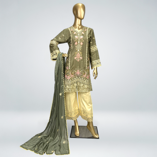 3-Piece Light Olive Cotton Embroidered Shirt with Chiffon Dupatta. MMG#33