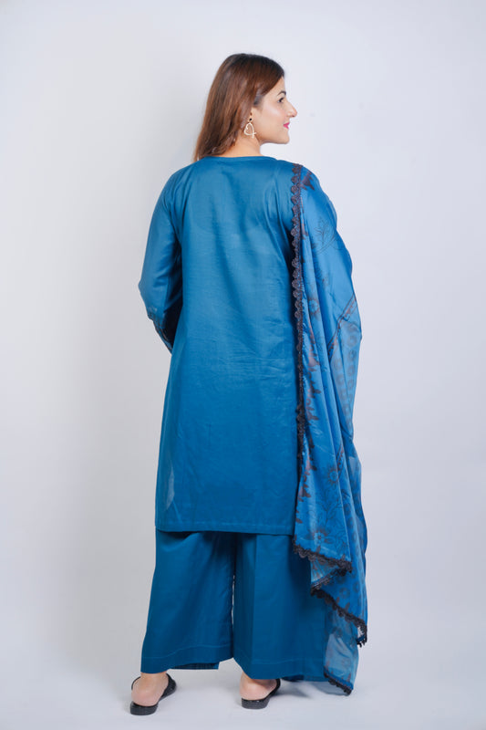 3-Piece Hague Blue Cotton Embroidered Shirt with Silk Dupatta MMG-22