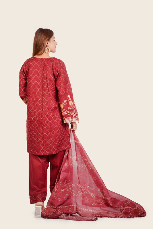 MOONLIT 3-PIECE CHIFFON EMBROIDERED SUIT MAROON MMG-786