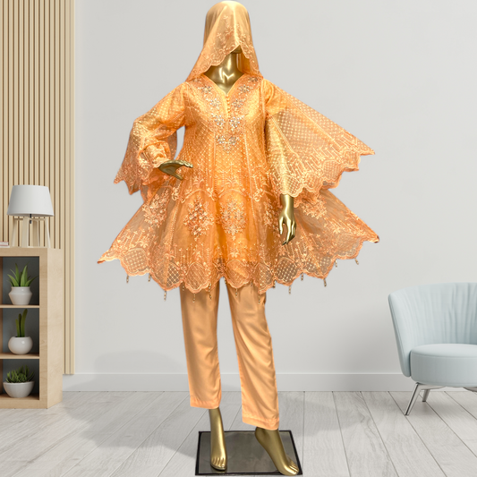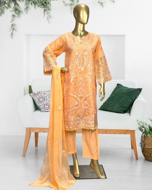 ZAREEHA|3-PIECE CHIFFON EMBRODIERED HANDWORK FROCK ORANGE MMG-843