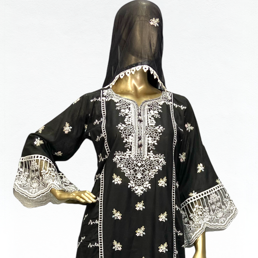 HALEEMA|CHIFFON EMB HANDWORK KURTA SET BLACK MMG-915