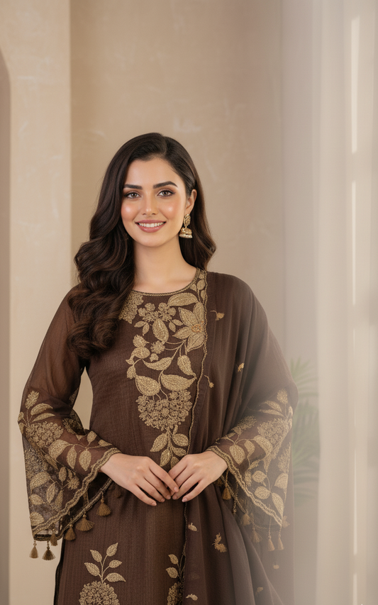 MAJESTIC WINTER ELEGANCE|3-PIECE KHADDAR EMBROIDERED SHIRT|EMBROIDERED FLAPPER|CHIFFON EMBROIDERED DUPATTA MMG-814