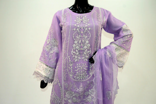 Elegant embriodred Organza Shirt with Chiffon Dupatta & Soft Malai Trousers MMG-806