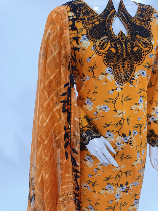 3-Piece 3D Chiffon Frock with Chiffon Dupatta MMG-809