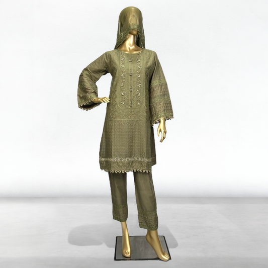 3-Piece Light Olive Cotton Embroidered Shirt with Chiffon Dupatta. MMG#33