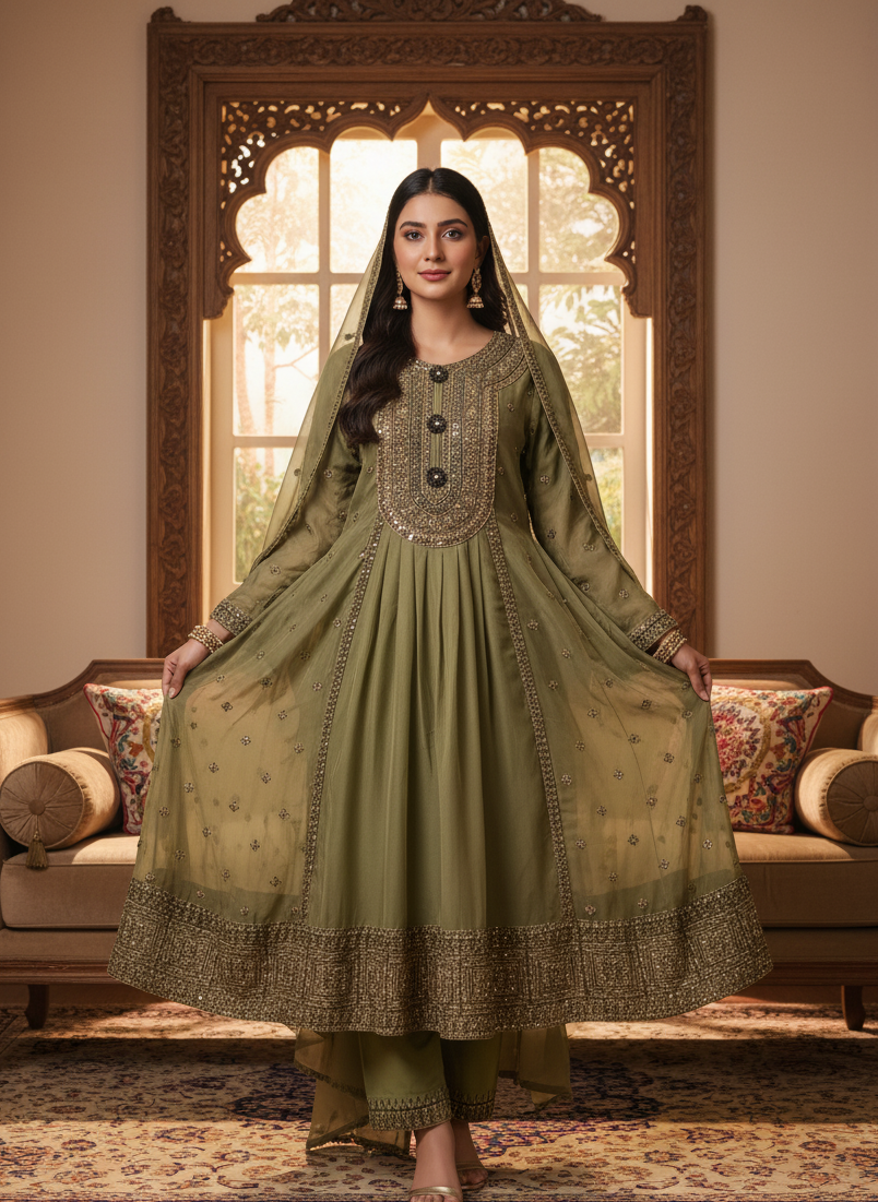The embroidered neckline adds a touch of refinement, while the soft crepe embroidered trouser ensures effortless comfort and movement. A chiffon embroidered dupatta completes the look with graceful flow and texture, making this outfit ideal for festive gatherings and cultural occasions.