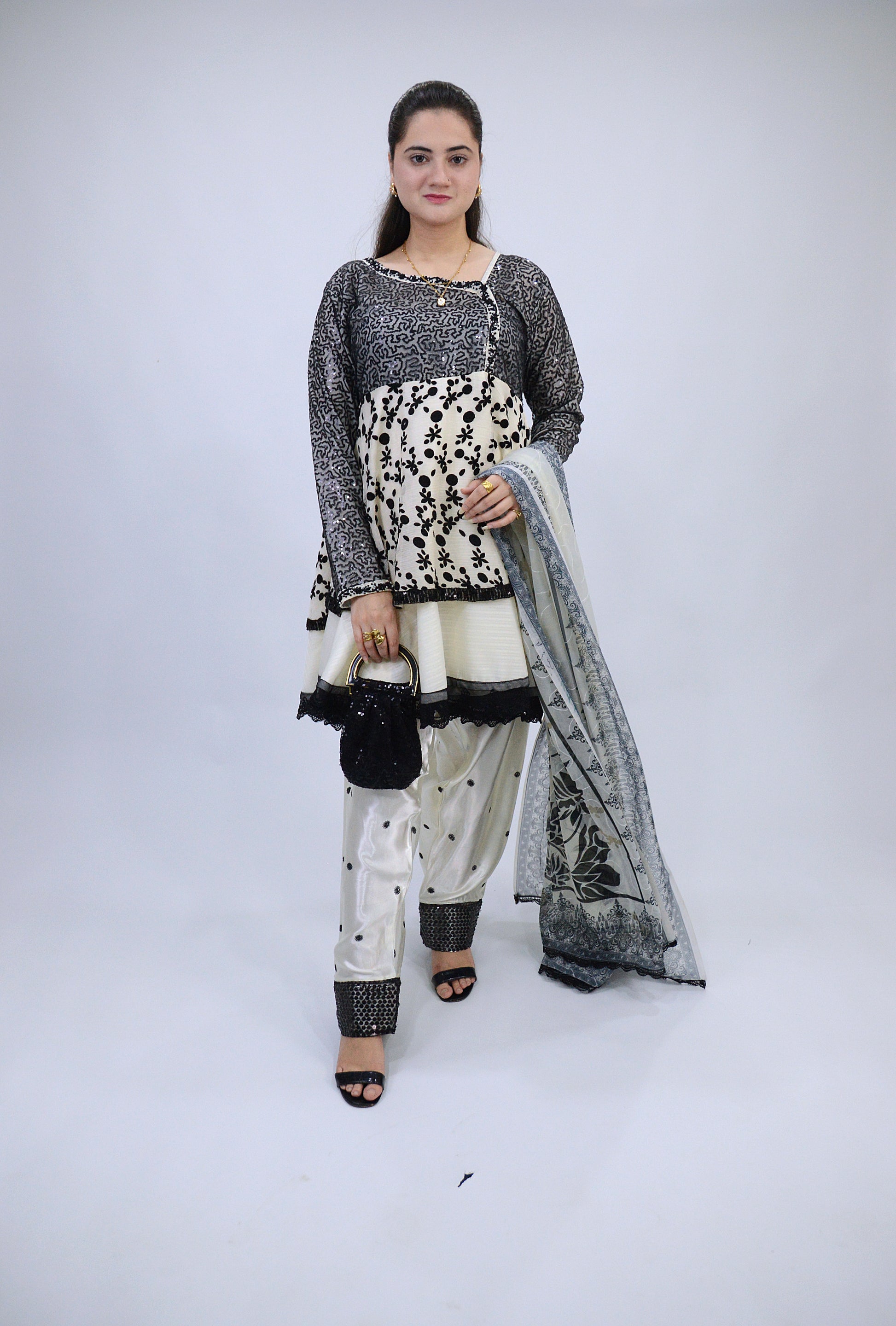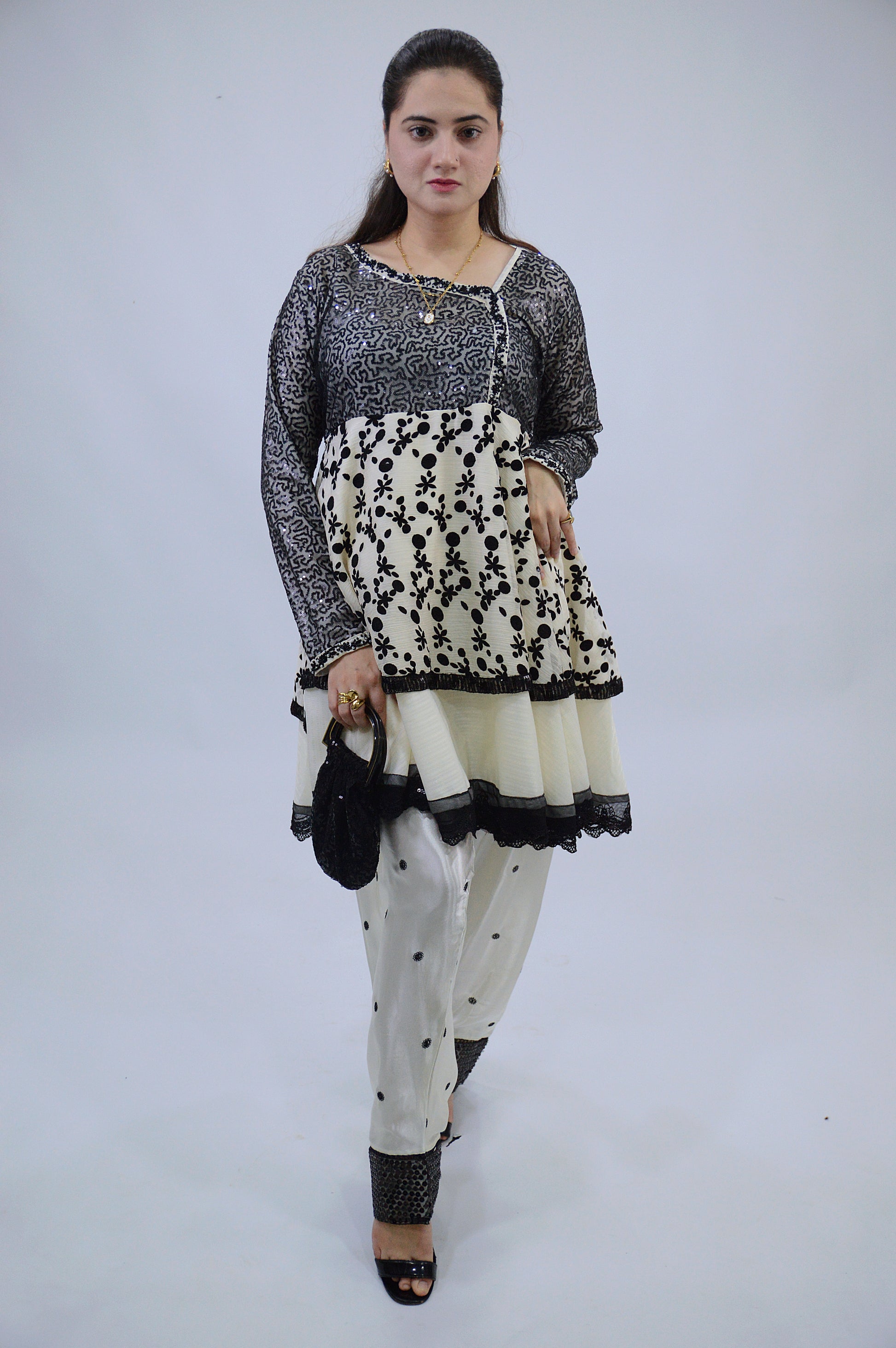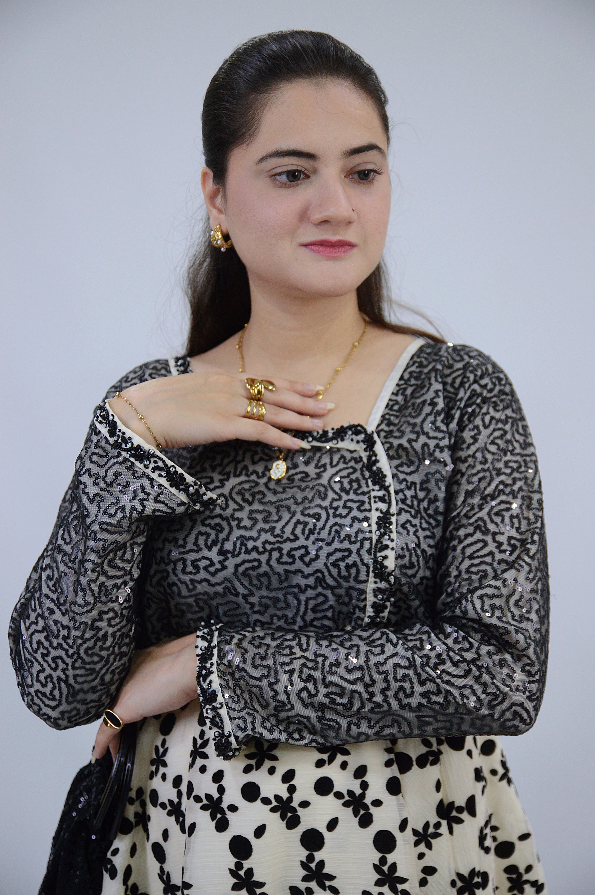 DOUBLE D-FROCK WITH SEQUENCE SITARA WORK|FARSI EMBROIDERED SHALWAR|SILK CHIFFON DUPATTA MMG-1015