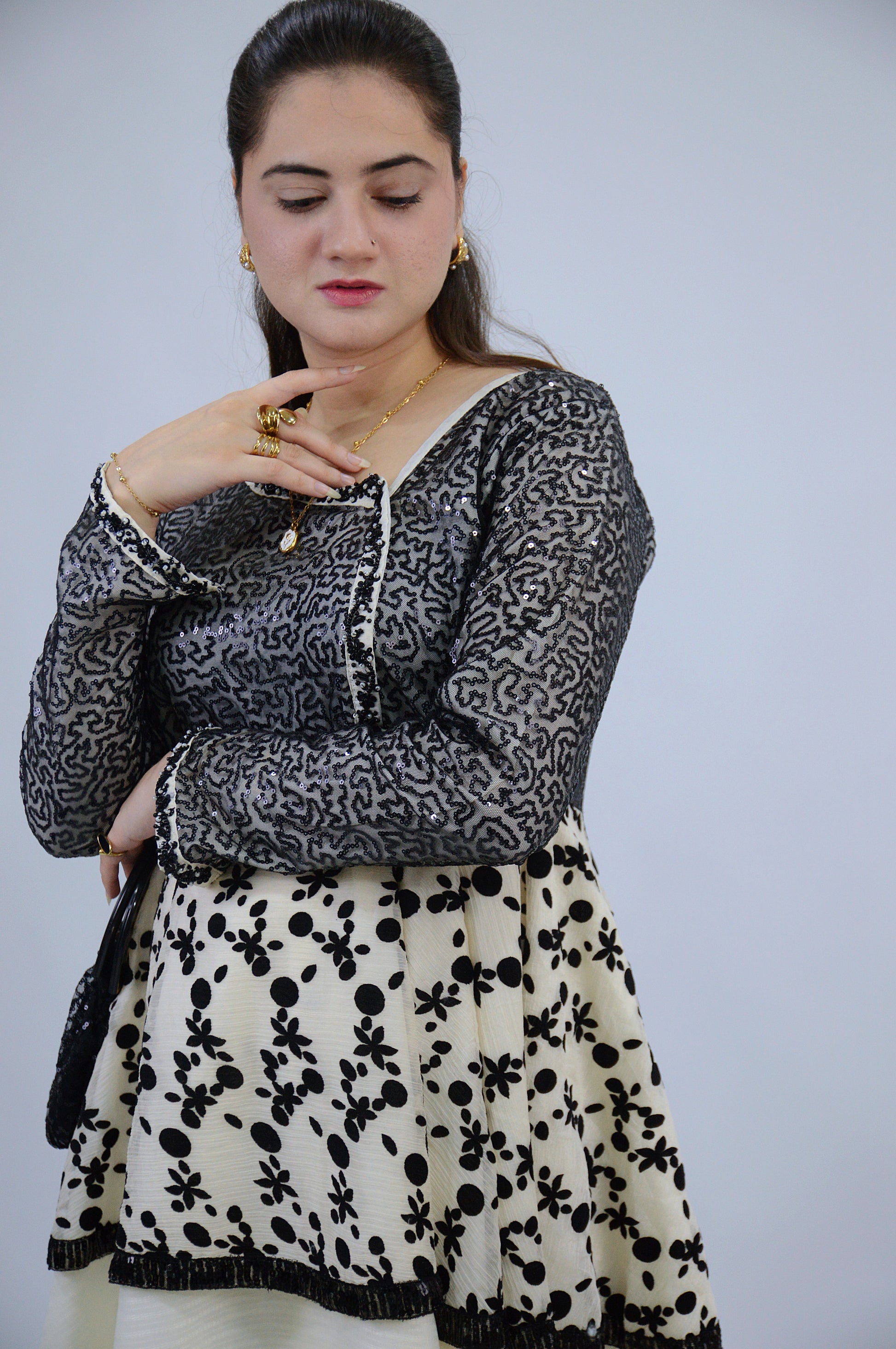 Step into the world of timeless artistry with our Classical Double D Frock, a masterpiece that redefines elegance. Crafted with meticulous detail, the frock is adorned with luxurious sequence sitara work on the body and sleeves, creating a radiant shimmer that speaks of sophistication and grace.