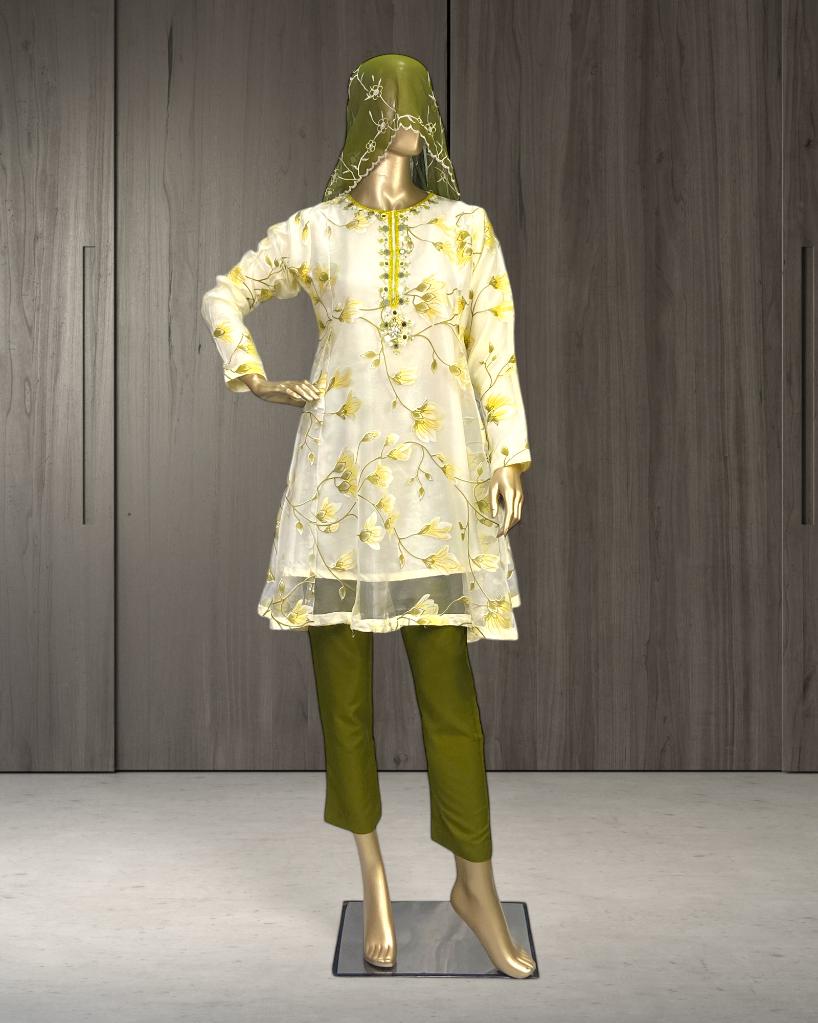 Upgrade your wardrobe with this exquisite 3-piece frock suit, crafted from premium fabrics for a graceful and elegant look. The printed tissue frock features delicate handwork on the neck, adding a touch of sophistication. Paired with a soft malai trouser for all-day comfort and a beautifully embroidered crinkle chiffon dupatta, this outfit is perfect for formal events, festive occasions, and celebrations.