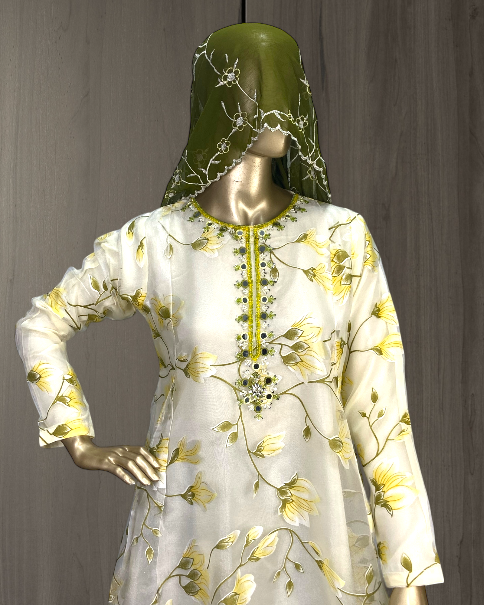 Elegant Printed Tissue Frock with Handwork Neck, & Embroidered Dupatta MMG-GG-730