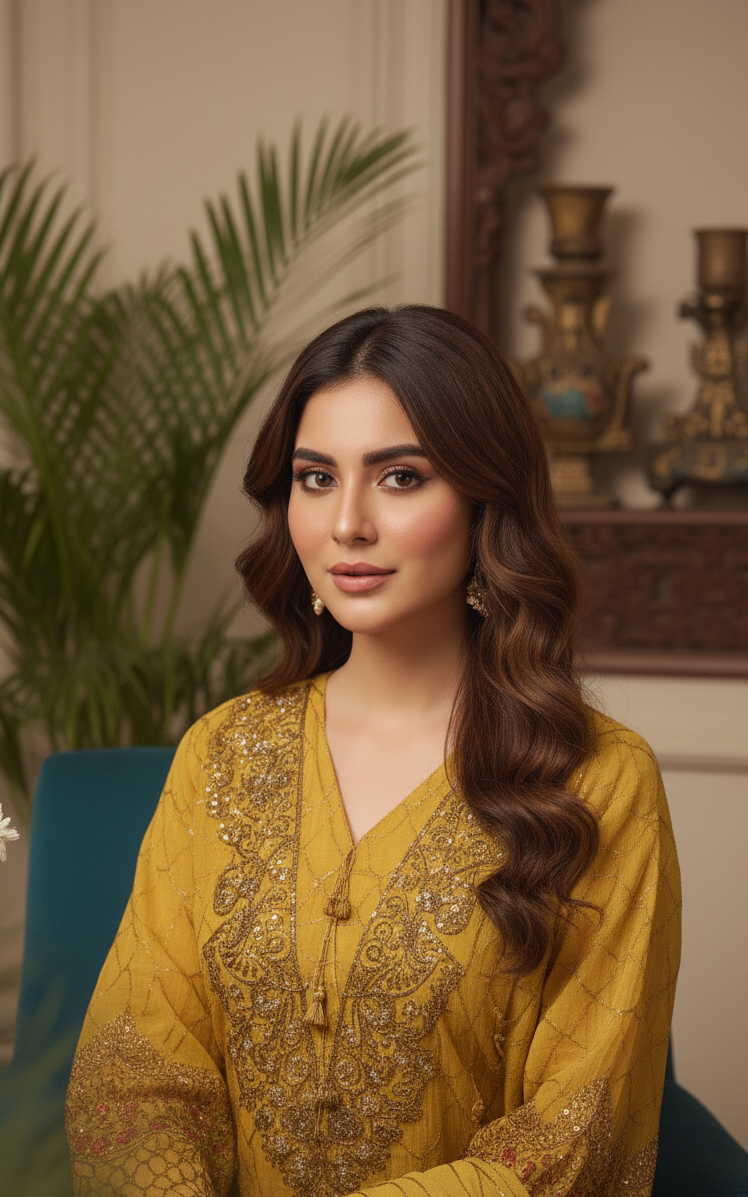 Styled with a luxurious jamawar trouser that adds a regal finish and a chiffon embroidered dupatta for flowing charm, LAMISSA is the epitome of refined beauty — ideal for weddings, festive gatherings, and special evenings.