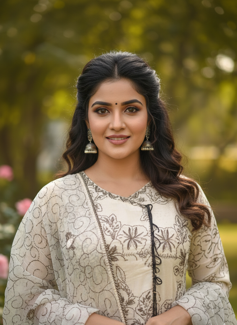 Paired with smooth silk sheller trousers, the ensemble offers both style and comfort. The look is beautifully completed with a finely embroidered chiffon dupatta, adding grace and sophistication to your entire appearance.