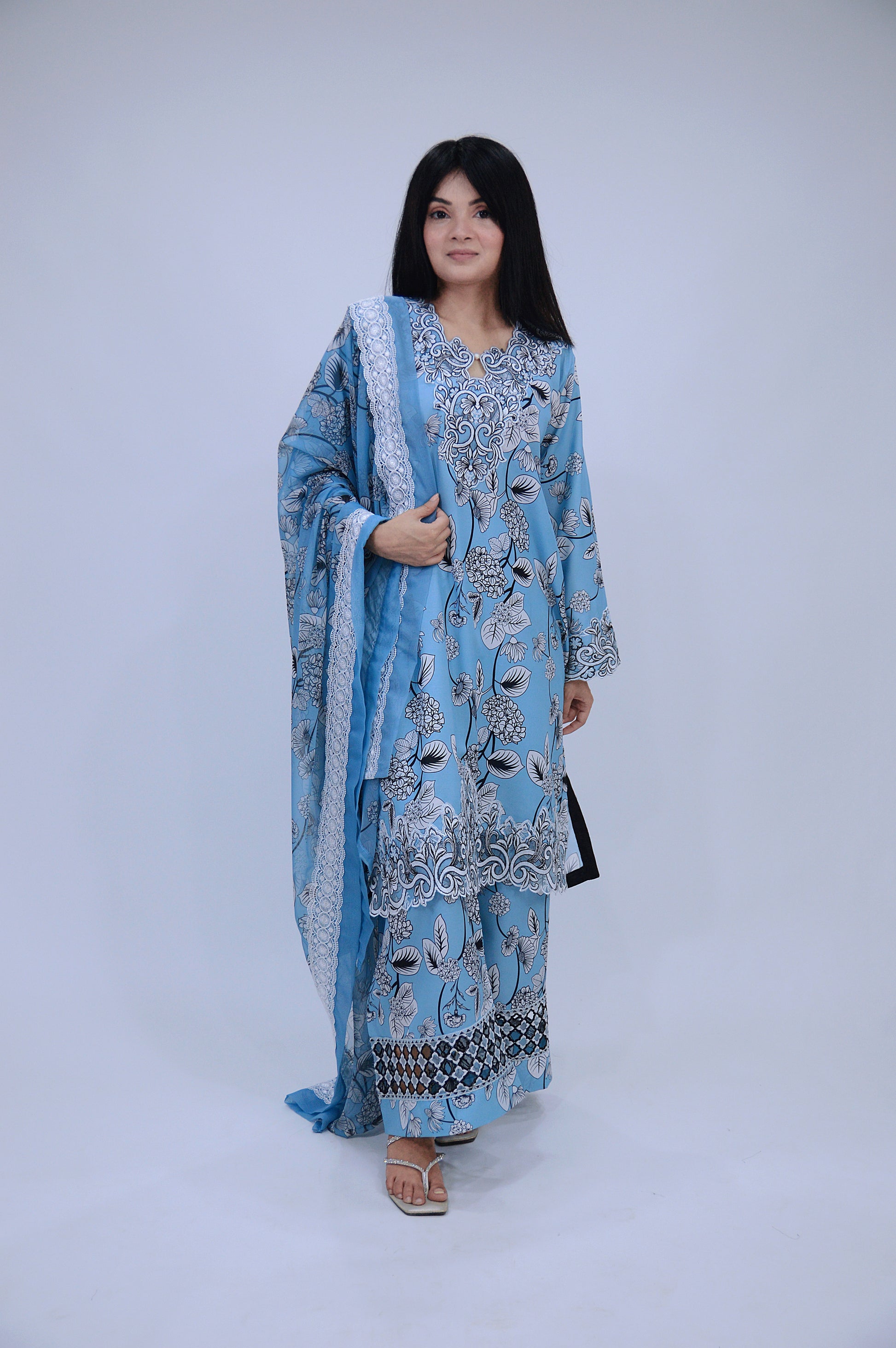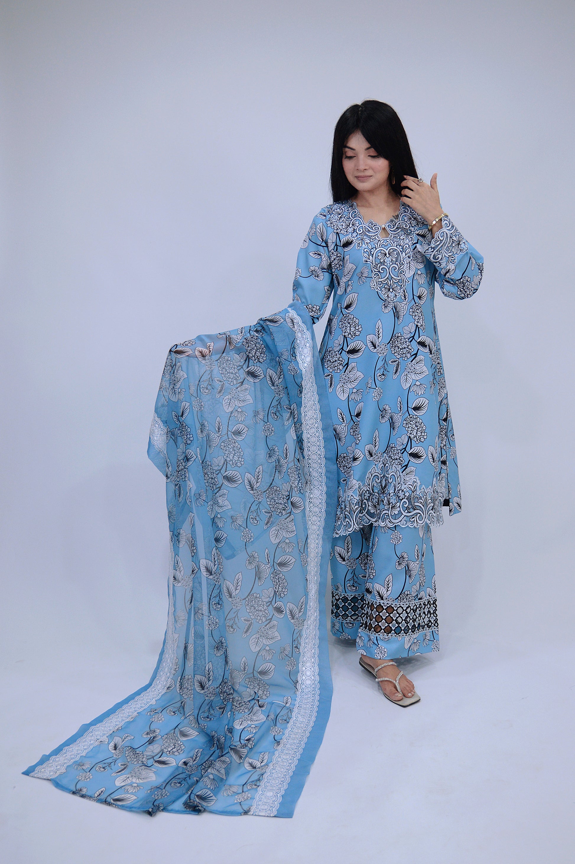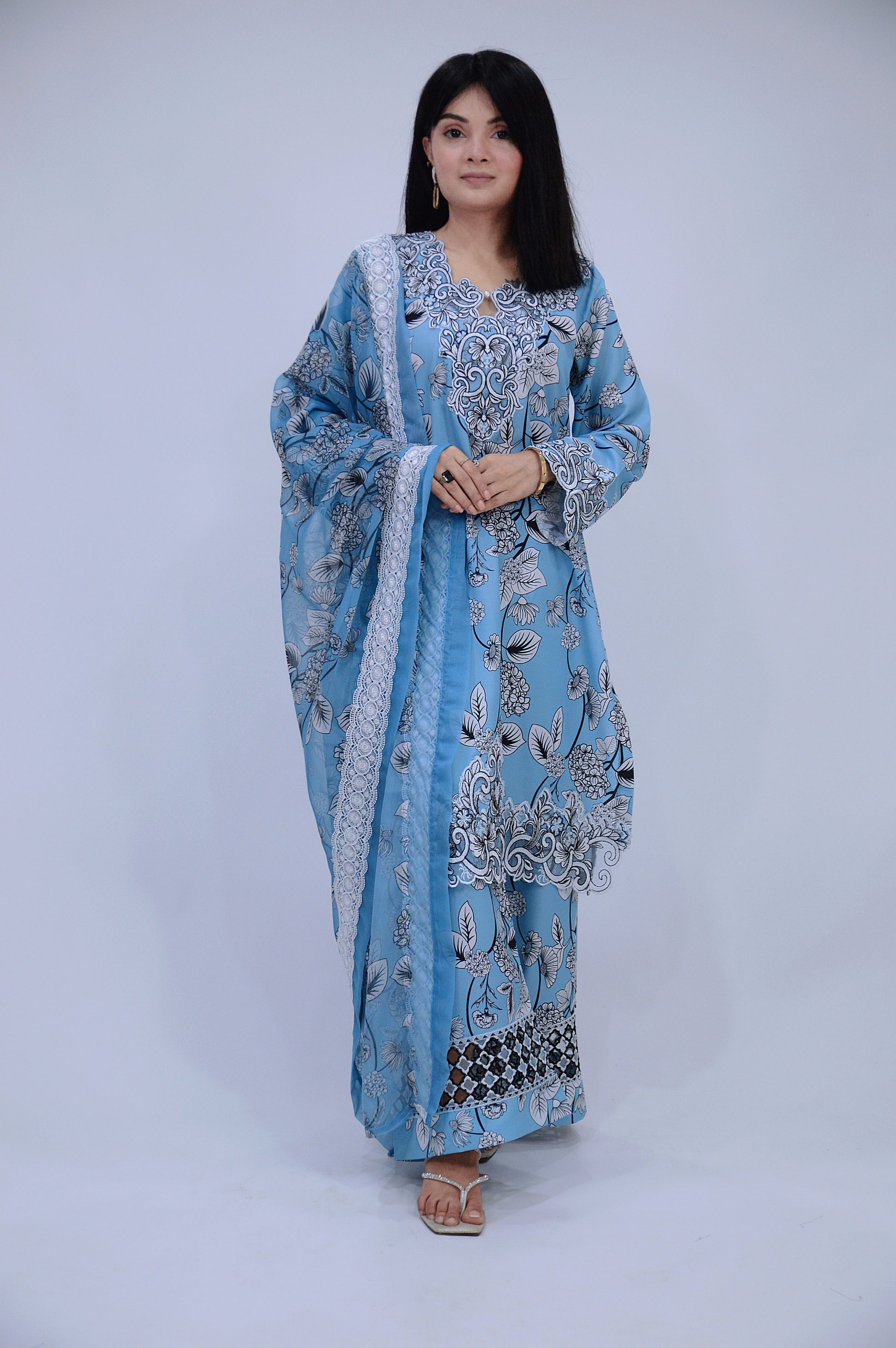 Paired with a digital printed Flapper for comfort and chic simplicity, the look is elevated with an embroidered cutwork flapper Silk Chiffon dupatta with elegant border, offering a perfect balance of tradition and contemporary fashion.