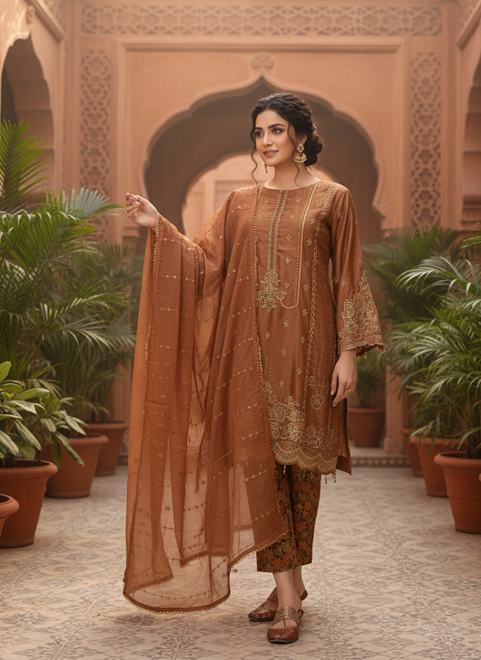 Elegant embriodred Organza Shirt with Chiffon Dupatta & Soft Malai Trousers MMG-806